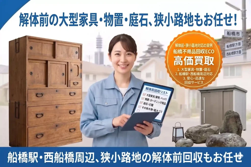 船橋駅・西船橋周辺の狭小路地も対応!解体工事前の大型家具・物置・庭石の回収