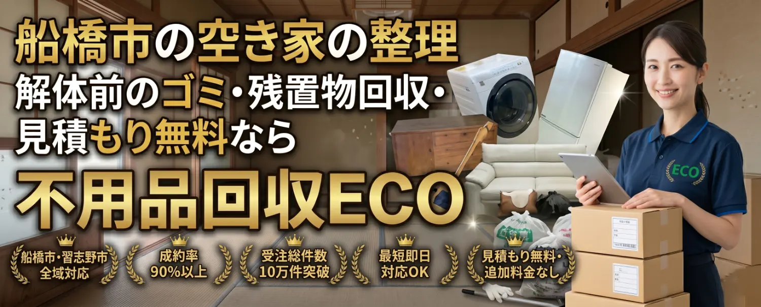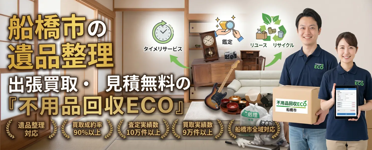 船橋市の不用品回収の見積査定、価値ある物は高価買取、引越し不用品回収など処分をする前に出張買取リサイクルショップをご活用ください。船橋不用品回収ECOにお任せください。