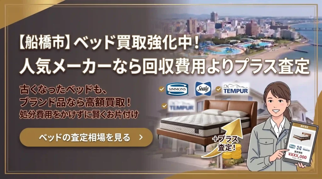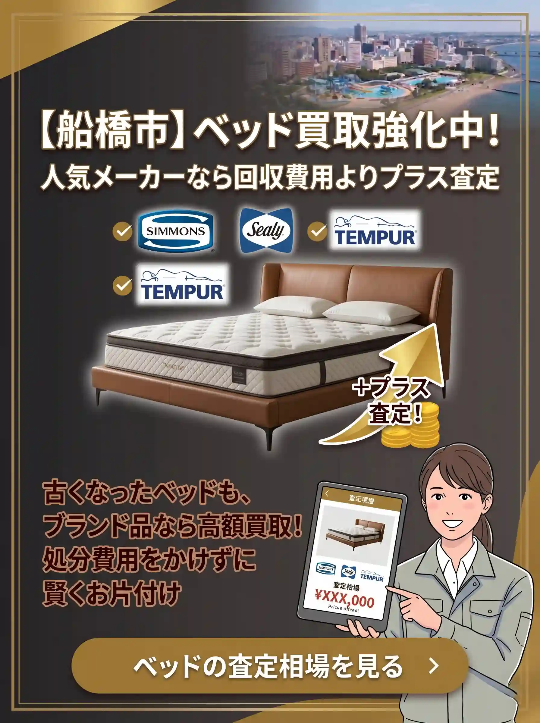 船橋市を中心に、市川市、習志野市、浦安市、鎌ケ谷市、八千代市など千葉県広域で、人気ベッドフレーム・マットレスの高価買取や、古くなったベッドの解体・不用品回収・処分に対応しています。