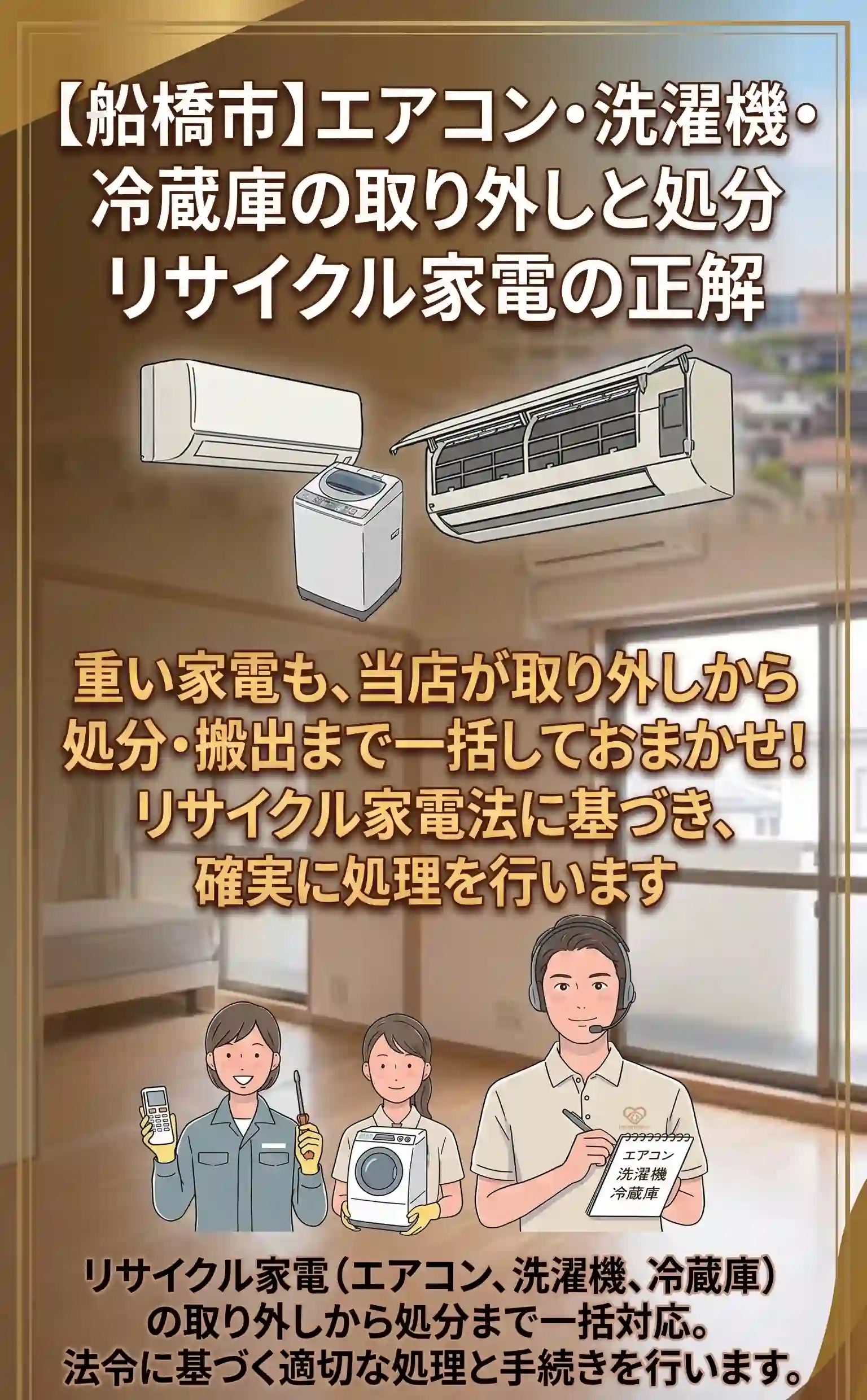 船橋市を中心に、市川市、習志野市、浦安市、鎌ケ谷市、八千代市など千葉県広域で、エアコンの取り外し、洗濯機・冷蔵庫などのリサイクル家電回収・高価買取に対応しています。