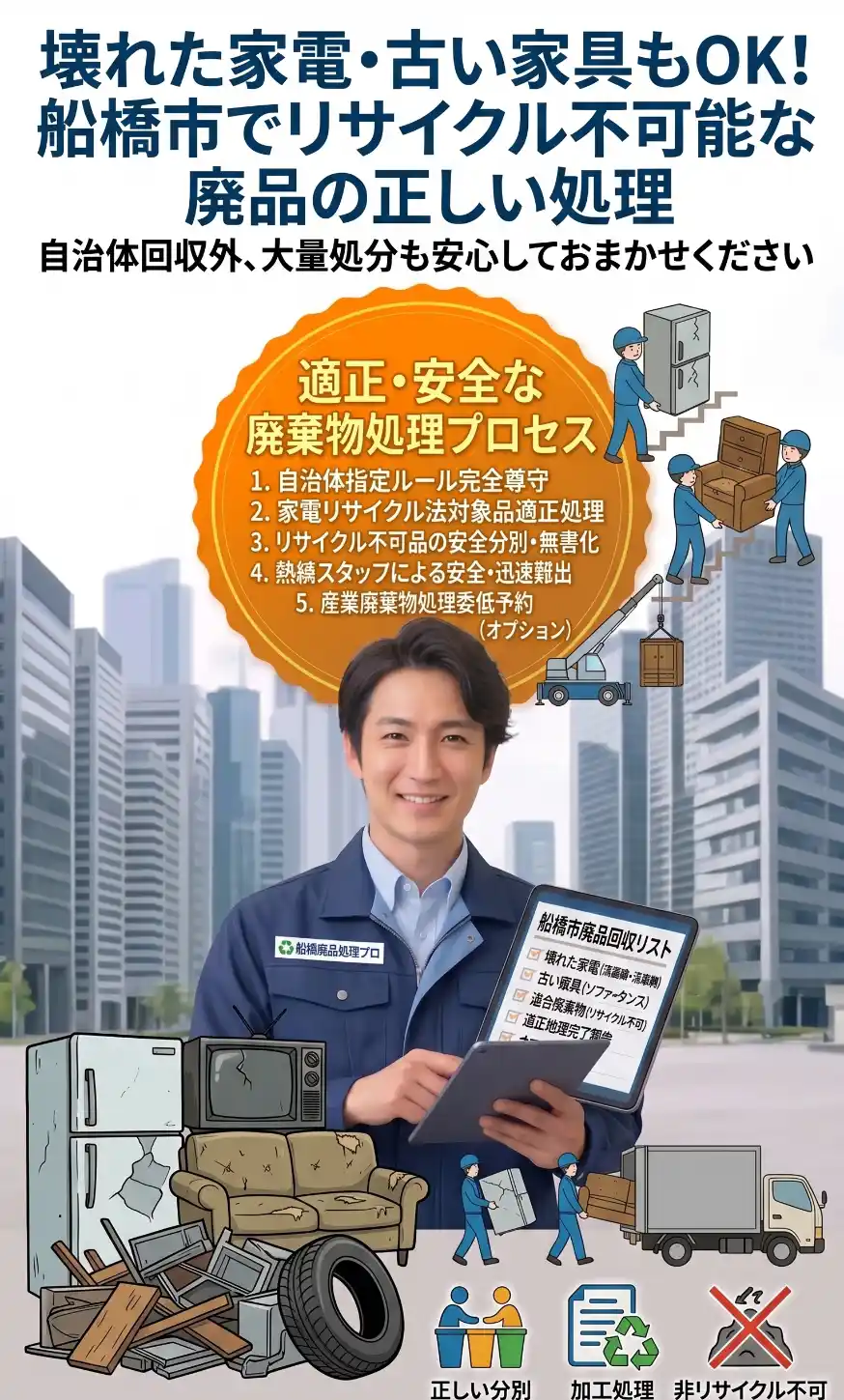 これら「リサイクル不可能な廃品」の中には、船橋市の通常収集や粗大ゴミとして簡単には捨てられない物が多く含まれます。地域密着の「船橋不用品回収ECO」なら、どんなに古くても、壊れていても回収OK!面倒な分別や解体、重い荷物の運び出し作業まですべてプロが代行します。法令に基づいた適正なリサイクル処理ルートを確保しているため、安心して丸ごとお任せいただけます。