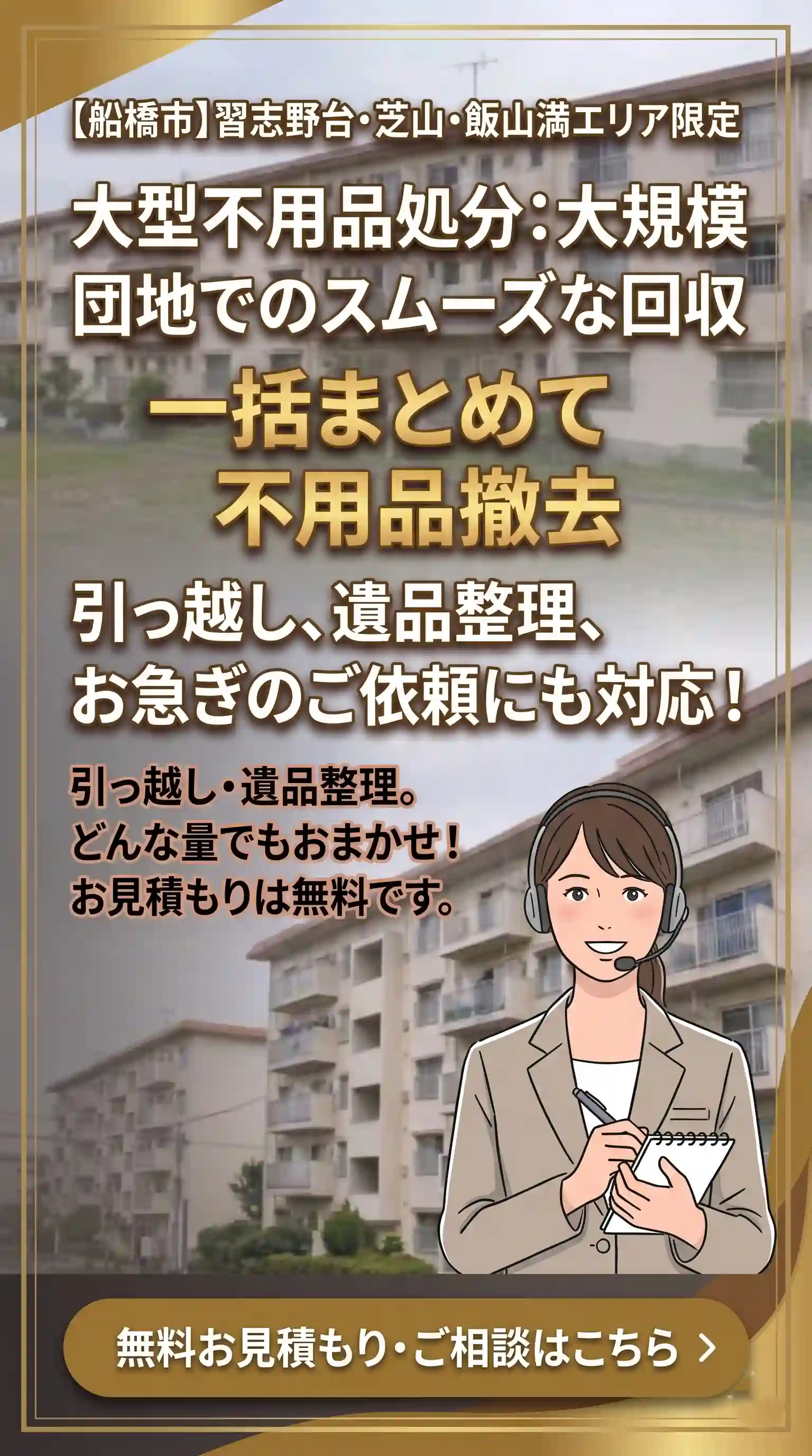 船橋市の習志野台、芝山、飯山満エリアなど、大規模な集合住宅や団地にお住まいの方が直面するのが、粗大ゴミの「搬出問題」です。