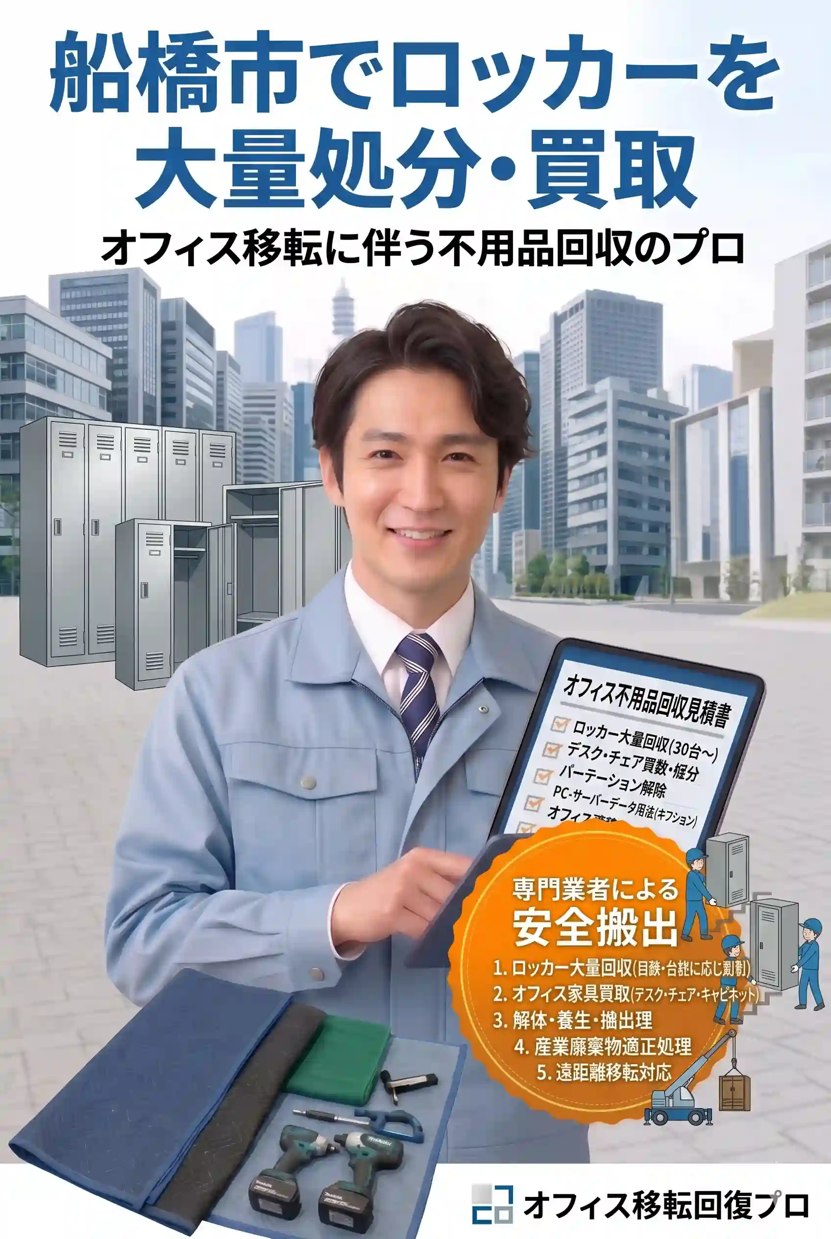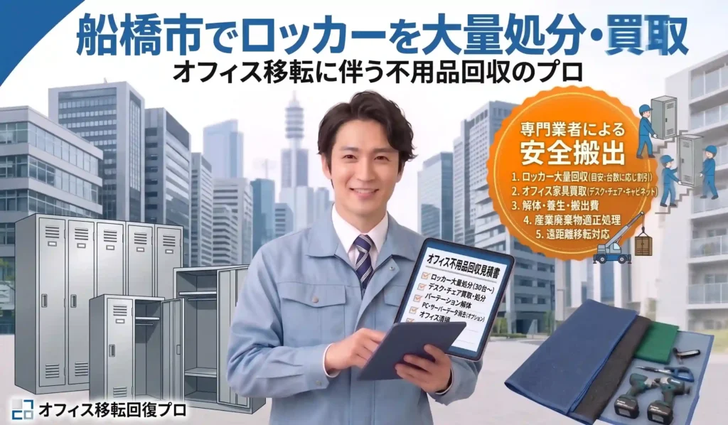 船橋市を中心に、市川市、習志野市、浦安市、鎌ケ谷市、八千代市など千葉県広域で、メーカー製ロッカー・オフィス家具の高価買取や、古くなった事務什器の解体・不用品回収・大量処分に対応しています。