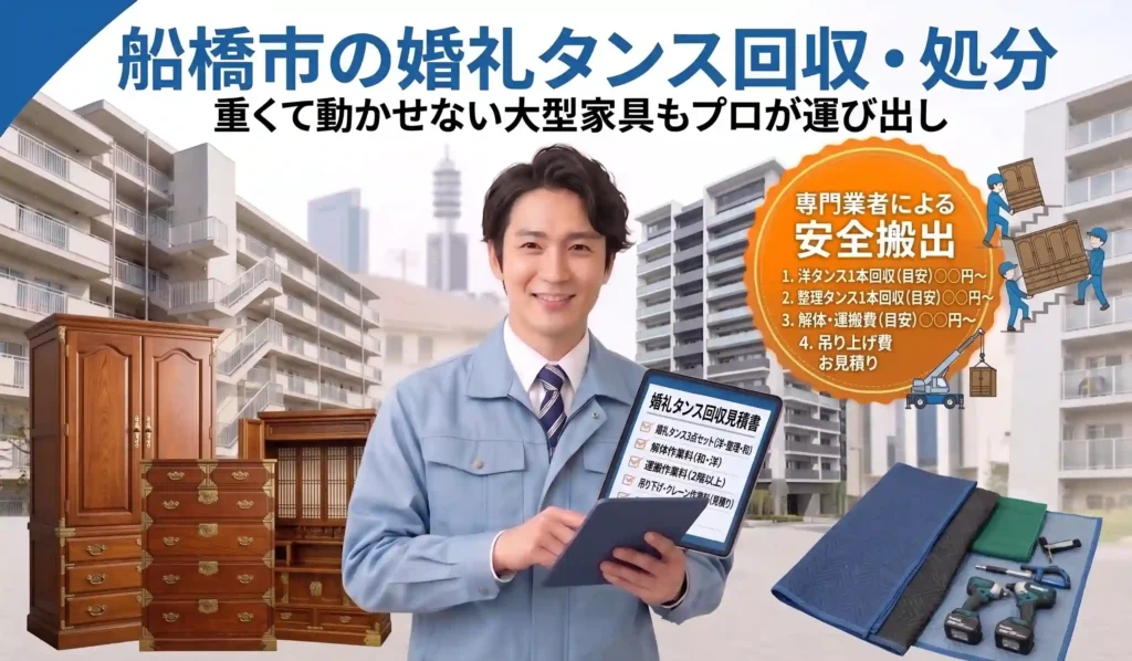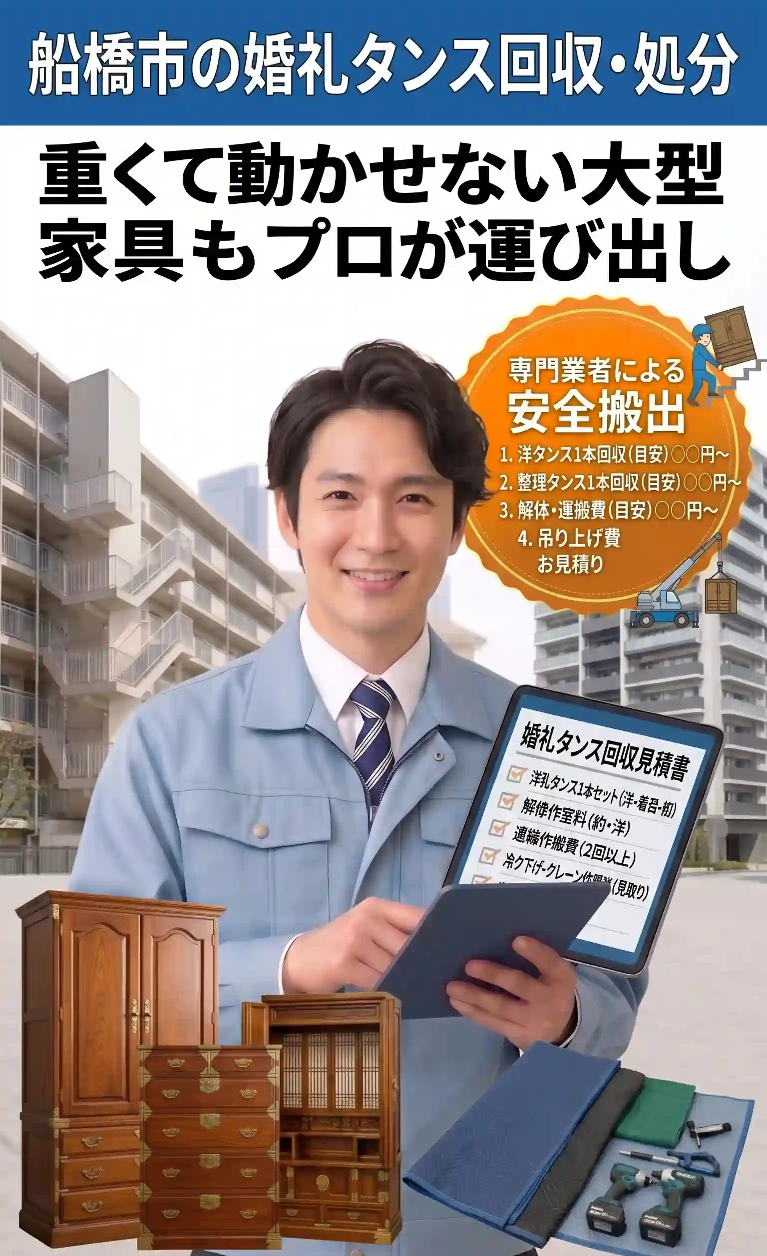 船橋市を中心に、市川市、習志野市、浦安市、鎌ケ谷市、八千代市など千葉県広域で、重い婚礼タンス(和タンス・洋タンス・整理タンス等)の不用品回収、室内解体、2階からの搬出・処分に対応しています。